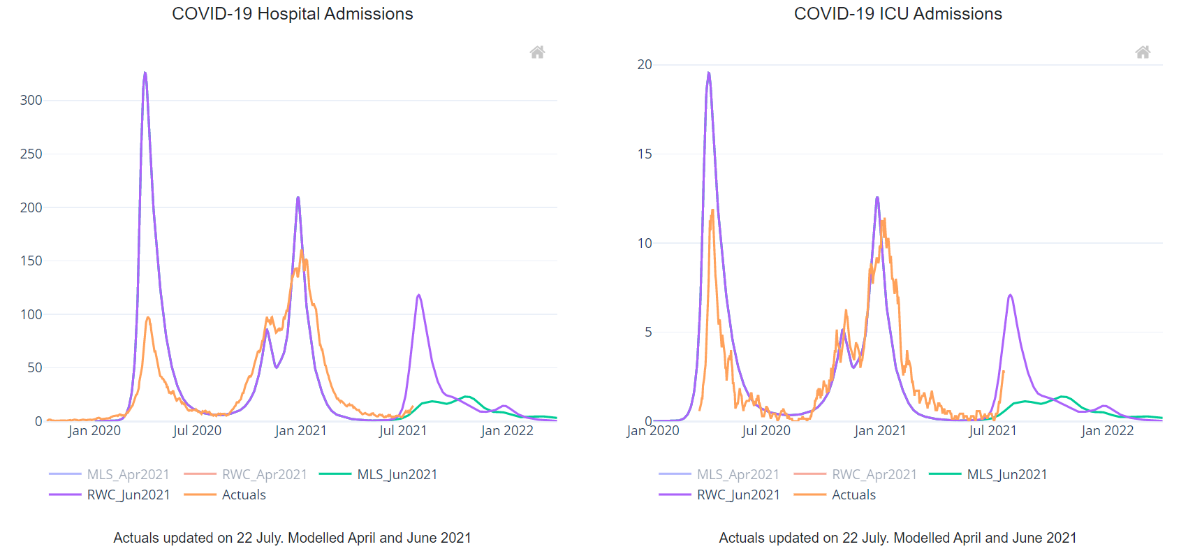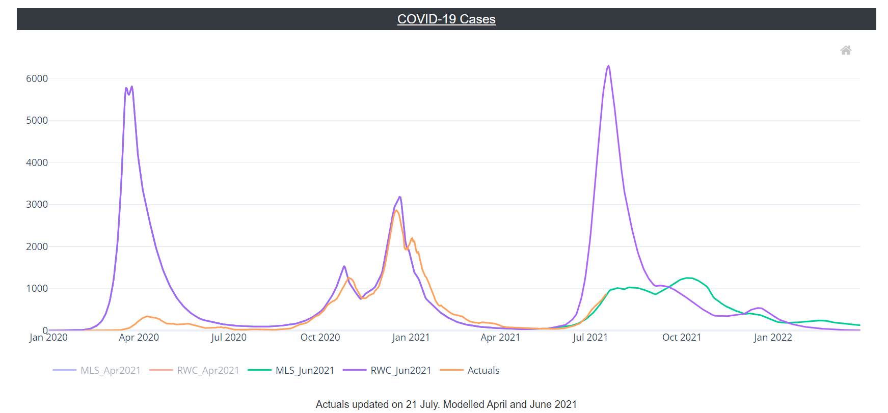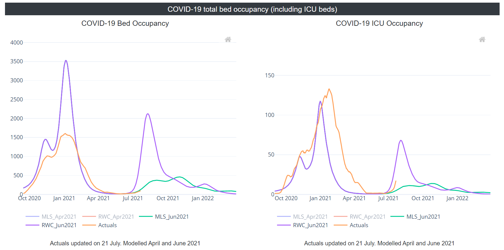 This report compares observed levels of COVID-19 indicators with the June 2021 RWC scenario and MLS for the first time. These scenarios take account of the impact of the Delta variant.