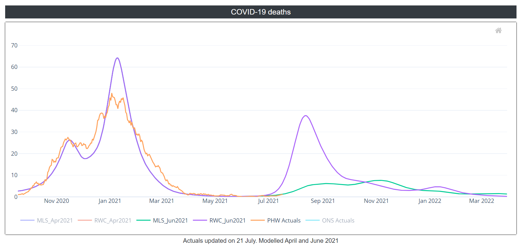 COVID-19 deaths fell from mid-January to late March and have been stable at a low level since April. The current death rate on 17 July (source: PHW) is at the level estimated by the MLS at just over 1 death per day. (Note that the RWC and MLS scenarios use the ONS COVID-19 Registered Deaths source to model their estimates.)