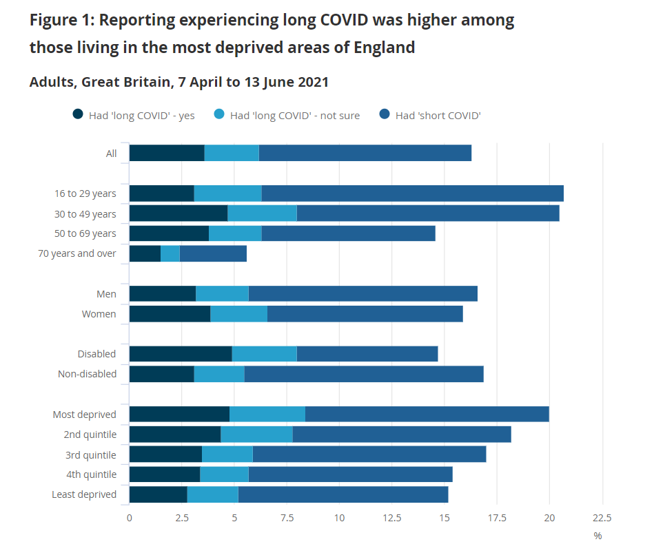 Self-reporting of experience long COVID was higher among those living in areas of higher deprivation, reflecting similar trends from the Coronavirus Infection Survey which found that long COVID prevalence was highest in people aged 35 to 69 years, females, people living in the most deprived areas, those working in health or social care, and those with another activity-limiting health condition or disability, although this may not be attributable to cause and effect relationships.