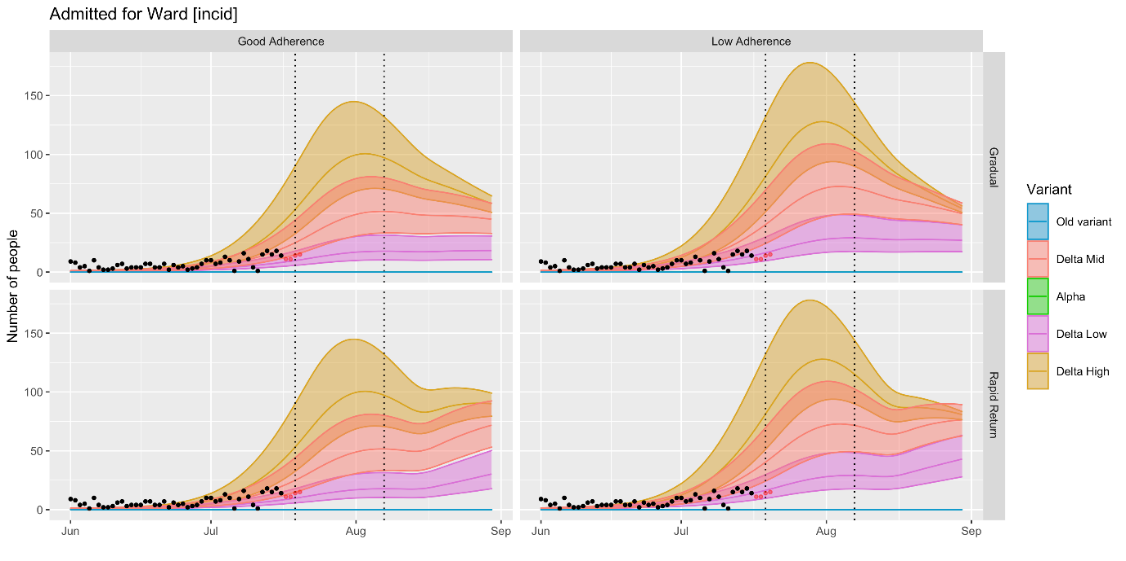 The modelling published on 12 July has now been updated with new vaccine rollout data, less optimistic assumptions on vaccine uptake in the young, a mid-estimate of delta transmissibility and the latest vaccine efficacy published by Public Health England.