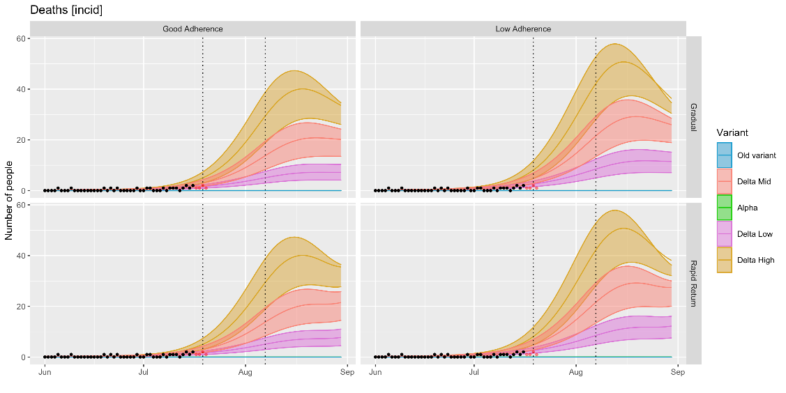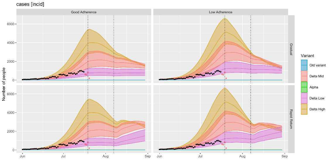 Cases are currently tracking with the lower estimates of ‘delta-mid’ or the upper-end of ‘delta low’. Current modelling suggests that cases could soon begin to plateau, partly as a result of reduced contact networks during the school break, although if all baseline population protective behaviours were to end following the 7 August announcement modelling (rapid return scenario) estimates a subsequent increase in cases, deaths and hospitalisation.