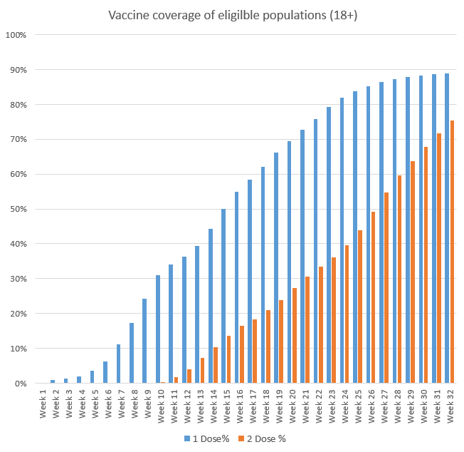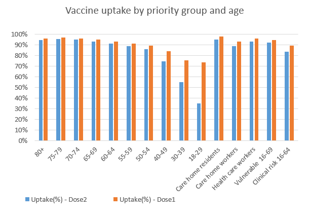 With 90% of the eligible Welsh population receiving their first dose of the vaccine, focus has largely shifted to giving people their second dose, with first dose take up for the 18-29 and 30-39 stabilising at around 75%.