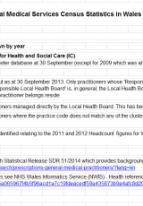 Cleifion cofrestredig a nifer ymarferwyr meddygon teulu yn ôl practis, 2013: tablau , Saesneg yn unig, math o ffeil: XLSX, maint ffeil: 137 KB