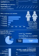 Gwybodaeth am fyfyrwyr a gafodd eu haddysgu i ryw raddau drwy gyfrwng y Gymraeg a'r staff academaidd sy'n gallu addysgu drwy gyfrwng y Gymraeg ar gyfer Medi 2017 i Awst 2018.