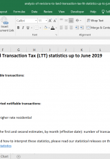 Dadansoddiad o ddiwygiadau i ystadegau’r Dreth Trafodiadau Tir hyd at Mehefin 2019 , math o ffeil: XLSX, maint ffeil: 2 MB
